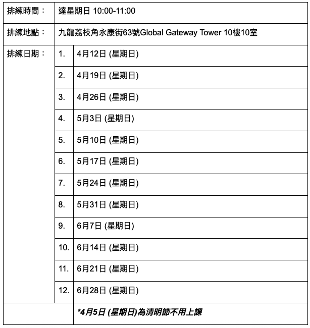 排練日期:4月至6月份逢星期日(共12堂)