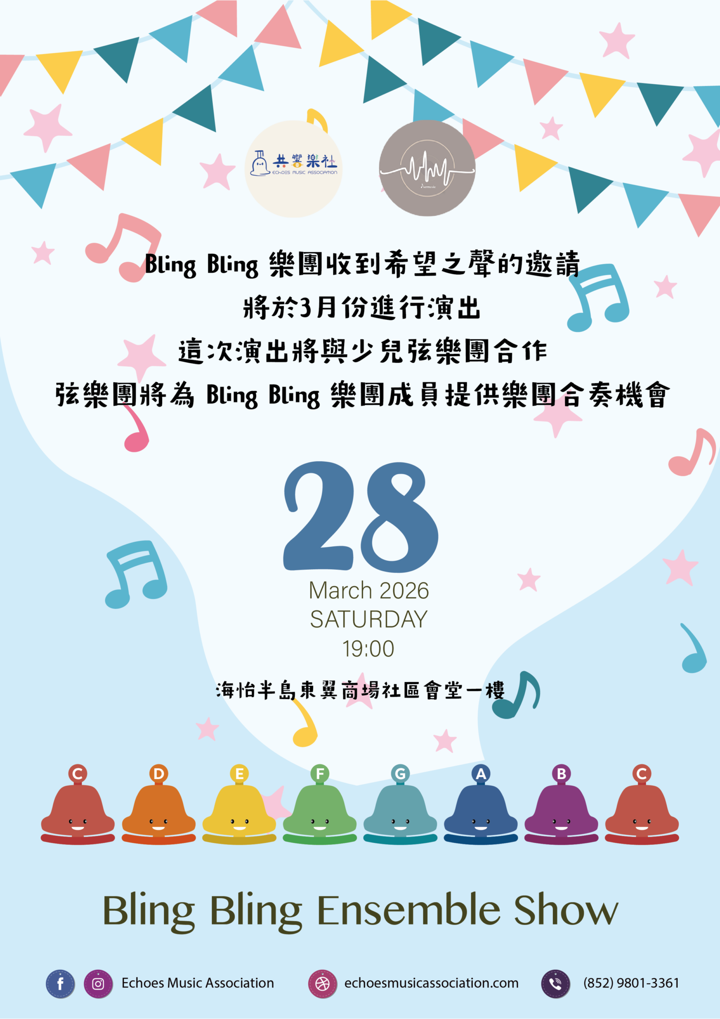 Bling Bling 樂團由4至6歲的小朋友組成的樂團!我們專注於演奏 Rainbow 樂器,讓小朋友在音樂中享受學習的快樂。每一次的演出都精心設計,啟發小朋友的音樂興趣,培養他們的創造力和自信心。